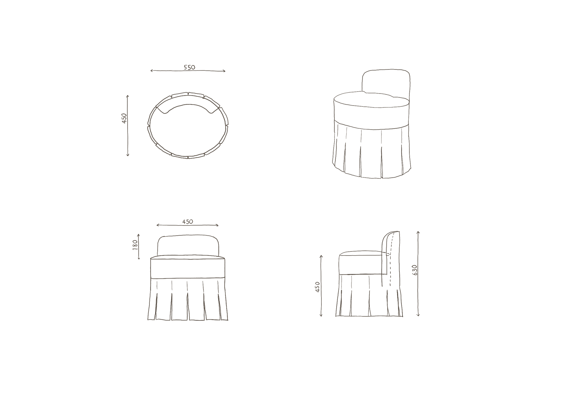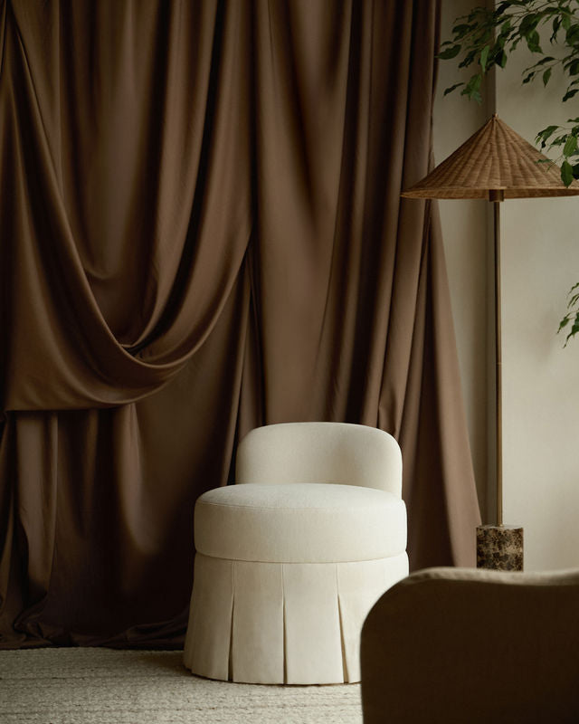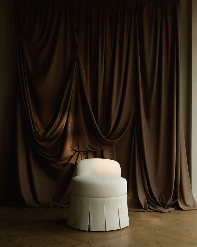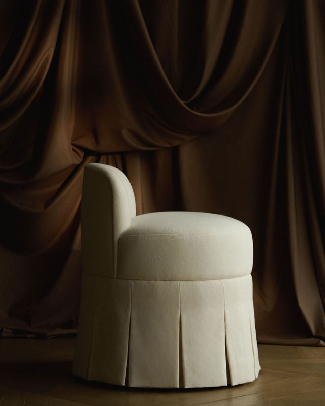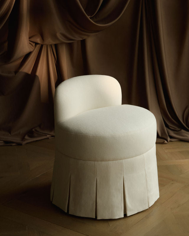 A compact, proportion-led oval stool with a low crescent back for gentle support. It slips neatly under a dressing table and perches beautifully in any room as occasional seating. Finished with a tailored, crisp skirt and structured pleats for a refined silhouette.